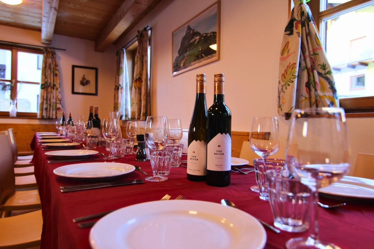 Upon entering catered chalet Levett, you arrive in the central hall, where you have access to both the sauna and the ski depot. The ground floor also features a cosy dining room with an open-plan kitchen, complete with a traditional Tyrolean stone oven that adds warmth and character. Here, a full breakfast is served in the morning, and a delicious three-course dinner is provided in the evening, all prepared by your personal chalet hosts.